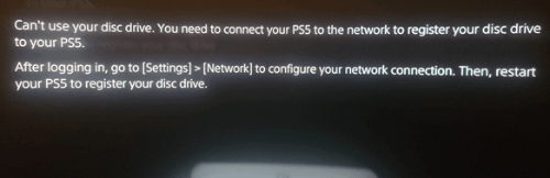 其中一张照片的通知上面写着:“无法使用您的光盘驱动器。您需要将PS5连接到网络,才能将光驱注册到PS5。登录之后进入设置网络选项配置网络连接,然后重启PS5以注册光驱。”
