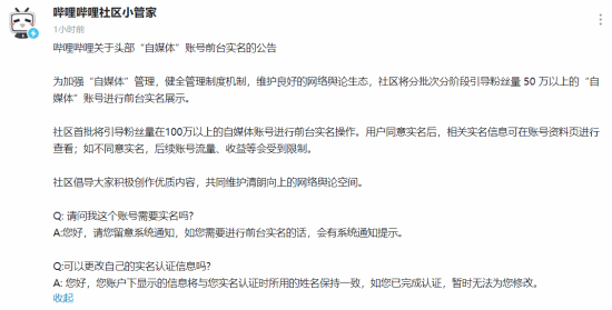 B站官方发布公告,宣布将分批次分阶段引导粉丝量50万以上的“自媒体”账号进行前台实名展示。首批将引导粉丝量在 100 万以上的自媒体账号进行前台实名操作。用户同意实名后,相关实名信息可在账号资料页进行查看;如不同意实名,后续账号流量、收益等会受到限制。
