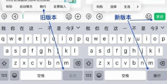 而如今在经过8.0.43版本的更新后,iPhone自带输入法原来的“发送”按键变成了“换行”按键,而对话框右侧则增加了发送键,这样就可以实现一键回车换行了。