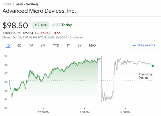 对于正在进行的季度,也就是2023年的最后一个季度,AMD预计营收将达到61亿美元,预计这将标志着5%的年增长率和6%的环比增长率。分析师此前预计AMD的财测为64亿美元,而3亿美元的亏损导致其股价在盘后交易中下跌。然而,这种下跌似乎是短暂的,在美国东部时间下午5点33分,该股的交易价格为98.40美元。几小时后,纳斯达克交易所的交易于晚上8点收盘,该股在最初下跌约4.4%后似乎已经稳定下来。(来源:Wccftech)