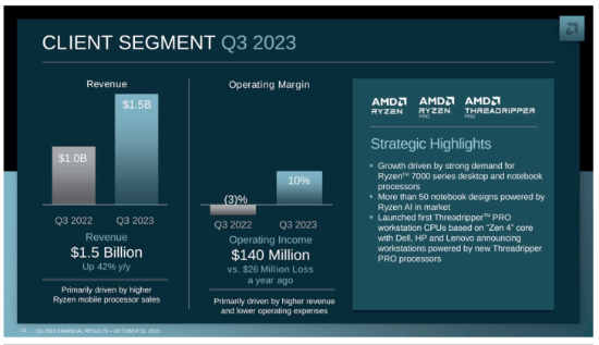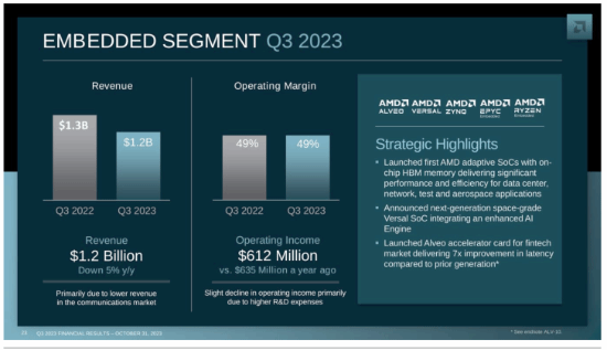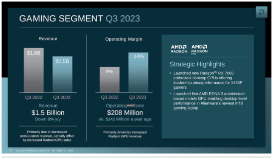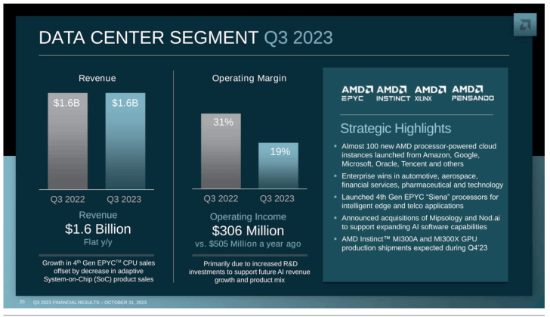 AMD公布了其2023财年第三季度的收益结果后,其股价在盘后交易中下跌了4%。在2023年第三季度,AMD的收入为58亿美元,年增长率仅为4%。然而,AMD的GAAP每股收益增长了350%,达到每股18美分,而去年同期为4美分。