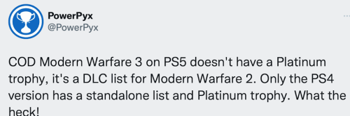 据奖杯指南网站PowerPyx透露,即将推出的《使命召唤20:现代战争3》PS5版似乎并没有白金奖杯,它被视为《COD19》的DLC。只有PS4版本有独立的列表和白金奖杯。