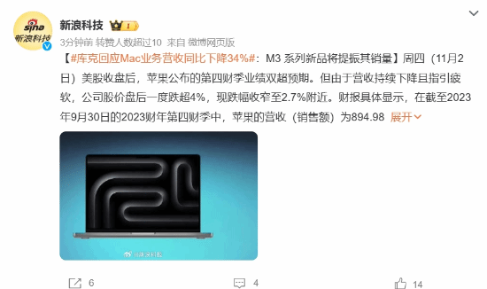 但硬件设备中只有iPhone录得(同比)增长,Mac、iPad等其他设备的表现均不如去年同期。其中,Mac收入为76.14亿美元,低于市场预期的86.3亿美元;iPad为64.43亿美元,高于60.7亿美元的预期。对此库克表示,个人电脑(PC)的整体市场“充满挑战”。他说道:“Mac将会在截至12月份的季度有一个明显更好的季度表现。我们有M3(芯片),我们有新产品。”
