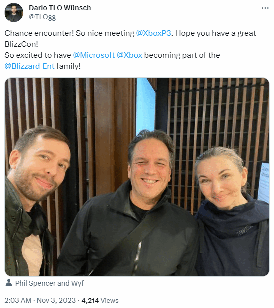 暴雪嘉年华今日举行,作为新领导的Xbox负责人菲尔·斯宾塞也来到了现场为暴雪站台。《星际争霸2》职业选手TLO晒出了与P3的合照,笑容十分灿烂。