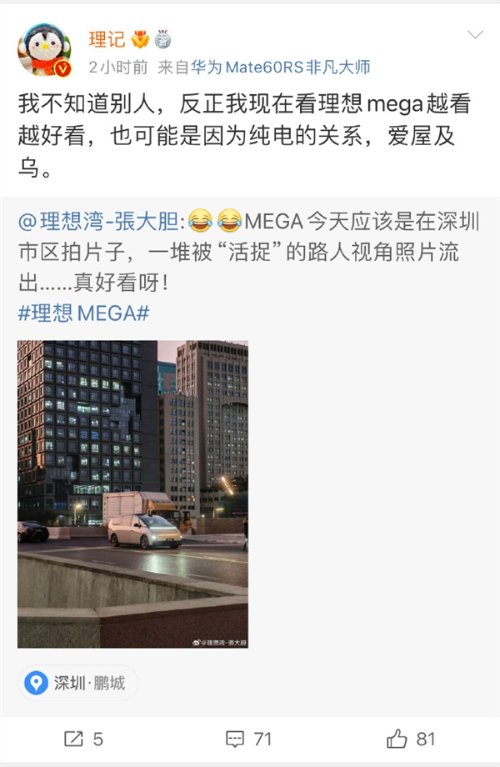 那么到底发生了什么让李想如此?从原博主配图来看,是微博上另外一个大V“理记”的截图,理记在转发一条有关理想MEGA的微博时表示:我不知道别人,反正我现在看理想mega越看越好看,也可能是因为纯电的关系,爱屋及乌。