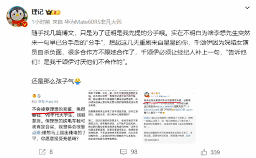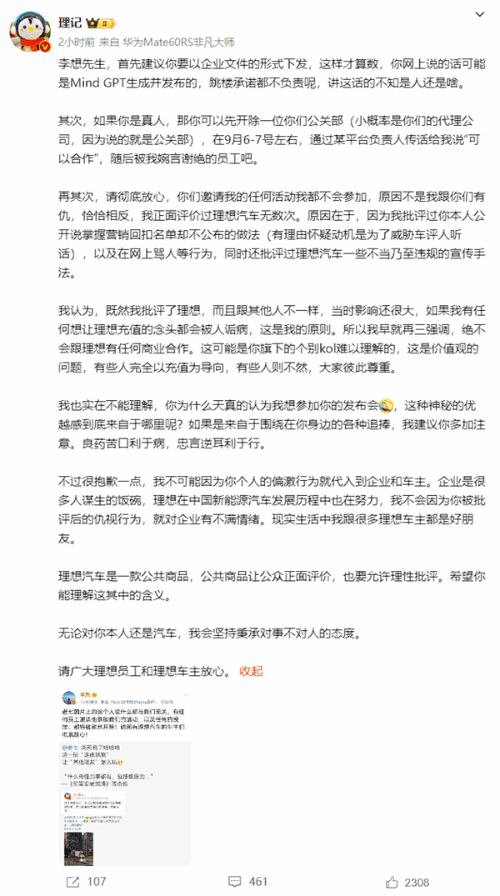 明明是称赞的内容,为何会惹到李想本人了呢?其实理记和理想、李想的恩怨由来已久,感兴趣的可以去其本人微博搜索关键词“理想”、“李想”等内容查看。突然间理记开始称赞理想,被不少亲近理想的kol解读为这是他在递“投名状”,于是就引发了争端。对于李想的“不邀请、不投放”言论,理记本人也有回应,不过内容较长,这里就不再展开,大家可看图参考。