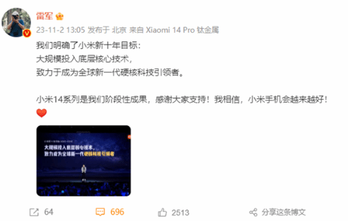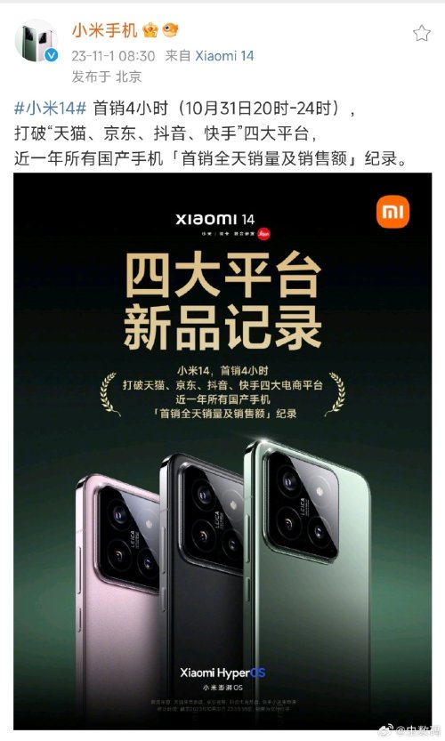 小米14系列已全面开售,部分型号出现卖断货的情况,销售火爆。今日,小米创办人,董事长兼CEO雷军发微博称,小米14系列是我们阶段性成功,我相信,小米手机会越来越好。