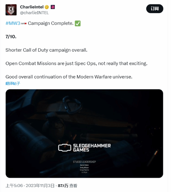 @charlieINTEL为《现代战争3》的战役模式给出了7/10的评价。