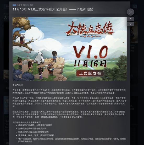 由“醋仙”——半瓶神仙醋开发的独立游戏《大侠立志传:碧血丹心》曾在今年3月开启了EA抢先体验。在经过了8个月的更新和制作后,工作室终于宣布将会在11月16日 发布游戏的V1.0正式版。
