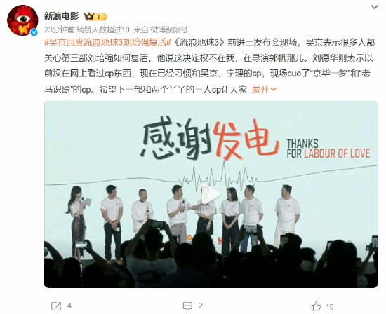 新浪电影消息,《流浪地球3》前进三发布会现场,吴京表示很多人都关心第三部刘培强如何复活,他说这决定权不在我,在导演郭帆那儿。