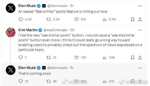 马斯克在X平台上发帖称:“基于人工智能的‘查看类似’帖子的功能正在推出。