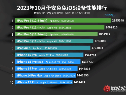 近日,安兔兔公布了10月份iOS设备性能榜。排行榜前两位均为搭载M2芯片的iPad Pro 6和iPad Pro4;三四名为搭载M1芯片的iPad Pro 5和iPad Pro 3;第五名为iPad Air 5;苹果新款手机iPhone 15 Pro和Pro Max位列五六。可以见得M2、M1芯片,相较iPhone 15 Pro的A17 Pro的跑分性能都要高出不少。