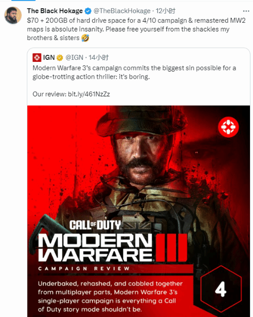 近日,海外知名内容创作者TheBlackHokage发文吐槽了这代新作:“《COD 20》拿走了你70美元和200GB的硬盘空间,给你的只是一个IGN 4分水平的战役和重制版MW2地图,这简直是离谱。”