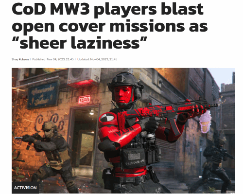 从目前来看,《使命召唤20:现代战争3》的战役部分显然是难以让玩家粉丝满意的。据dexerto消息,不少玩家严厉的批评了本作的开发人员,指责其所谓的开放式战役任务是“纯粹的懒惰”。