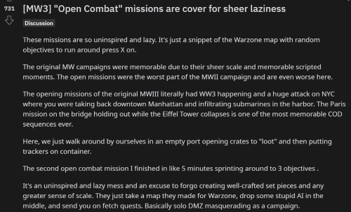 有玩家在Reddit发帖表示“开放式战役”是为了掩盖开发者的懒惰:“这些任务是如此缺乏灵感,看不到开发者的诚意,是为无法精心创造场景和大规模内容所找的借口罢了。他们只是拿了一张为战区制作的地图,在中间放了一些愚蠢的NPC,然后给你委派任务。”