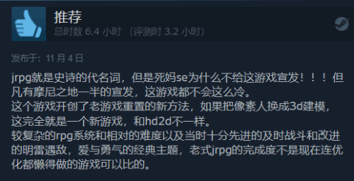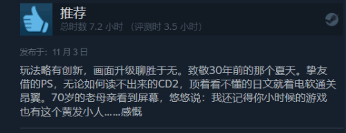 玩家评价方面,基本上都是好评,好评主要集中在:游戏情怀满满,治好了电子阳痿,游戏元素很丰富,复古像素人物配上3d场景,画面很不错。而差评主要是有玩家觉得这游戏的操作性太烂了。