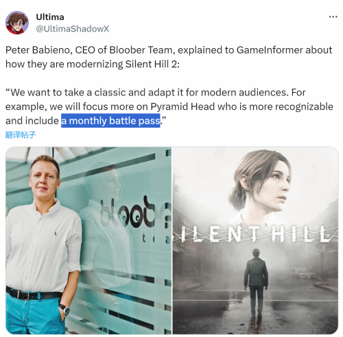 博主Ultima分享了一段开发商Bloober Team首席执行官Peter Babieno此前的采访,他曾表示希望将《寂静岭2》改编成更适合现代的作品,例如更多的关注大家所熟知的三角头,以及月度战斗通行证。