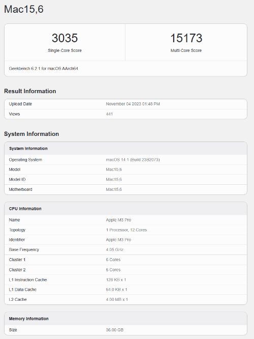 从Geekbench列出的“Mac15,6”标识符来看,该跑分来自于14英寸的MacBook Pro机型。该机运行macOS 14.1系统,配备 36.00 GB内存。