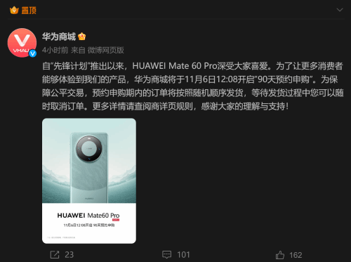 华为官方表示自“先锋计划”推出以来,HUAWEI Mate 60 Pro深受大家喜爱。为了让更多消费者能够体验到华为产品,华为商城将于11月6日12:08开启“90天预约申购”。