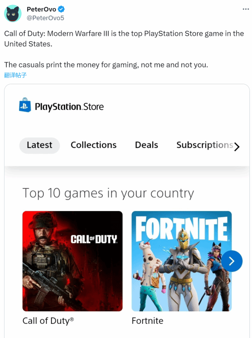 此外,根据博主PeterOvo5分享的截图显示,《使命召唤》现在也是北美PS商城上排名最高的游戏之一,在Xbox平台也有着不俗的热度。当然,平台计算的数据应该还包含当前战区以及前作现代战争2中的玩家数据,并不完全是现代战争3。