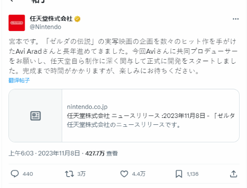 此外,宫本茂在任天堂官推表示,《塞尔达传说》的真人电影企划已经和Avi Arad一起筹划多年,这次请Avi Arad担任联合制片人、任天堂深度参与制作的影片已正式开始开发。离完成还需要一段时间,敬请期待!