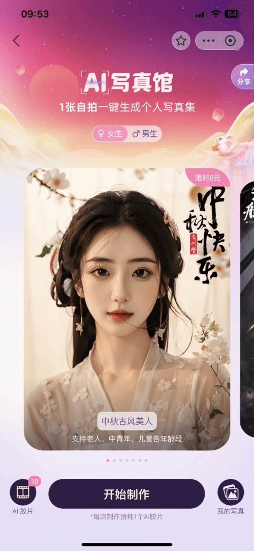 目前可生成风格有古风的,杂志风的,航天员风格的等等,多人合照、全家福等主题写真服务也正在路上。