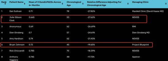 克拉克最近的测试结果显示,实际年龄每增加一年,她生理年龄只会增加0.665岁。该测试考虑了参与者在六个月或更长时间后的平均衰老速度得分。相比之下,46岁的约翰逊每天要吃数十种药片,还有一支30人医生团队护理,但是他目前只排名第六。约翰逊实际年龄每增加一年,他的生理年龄增加0.72岁。