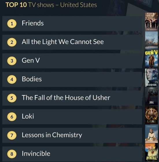 演员马修·派瑞意外离世后,他主演的《老友记》上周重回流媒体收视率冠军位置,网飞二战剧《所有我们看不见的光》以及亚马逊《V世代》分列二、三名: