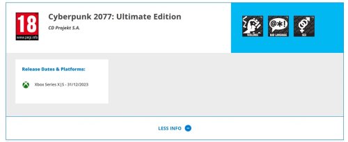 PEGI最近还为《赛博朋克2077》评为“终极版”,但此后该评级已被删除。(来源:wccftech)