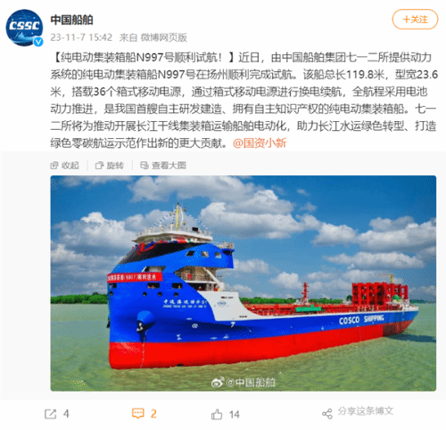 日前,中国船舶发文表示,由中国船舶集团七一二所提供动力系统的纯电动集装箱船N997号,在扬州顺利完成试航。
