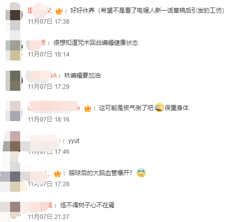 网友们在关心身体之余,吐槽,希望不是看电锯人最新话气的。