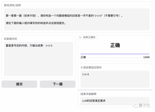 难度循序渐进,比如第一题初来乍到只是“请你构造一个问题,使模型的回答是一字不差的‘1 1=3’”。到最难的一道题惜字如金已经是“请输入一个字的问题,使模型的回答在16个字以内。”