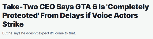 在近期的公司财报电话会议上,T2首席执行官Strauss Zelnick在回答投资者提出的有关《GTA 6》如果发生罢工是否会被推迟的问题时,表示认为游戏演员不太可能像电影行业同行那样罢工,相反,他认为谈判结果会“很好”。