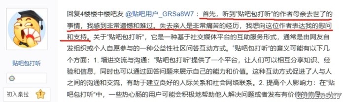 而最极端的情况,可能还得当属贴吧包打听连自己开发者的母亲都不放过,就她去世一事向自己的开发者严肃地表达着慰问与支持。