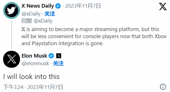 推特账号X News Daily报道了这一新闻,并表示由于推特已经成为主流平台,取消集成会让PlayStation和Xbox玩家很不方便。马斯克该该推文下面回复到:“我会调查此事”。