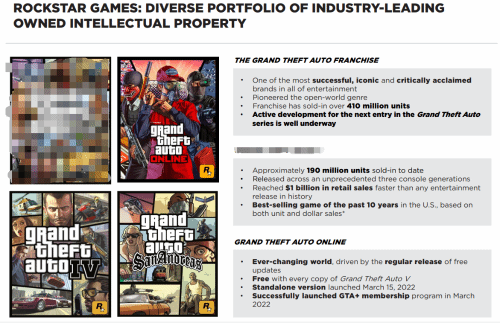 财报表示,作为最成功、最具标志性、最受好评的娱乐品牌之一,《GTA》系列开创了开放世界类型游戏的先河,累计销量已超过4.1亿部。《给他爱5》迄今已售出约1.9亿部,其零售额达到10亿美元的速度超过了任何娱乐产品,也是过去十年中美国最畅销的游戏之一。
