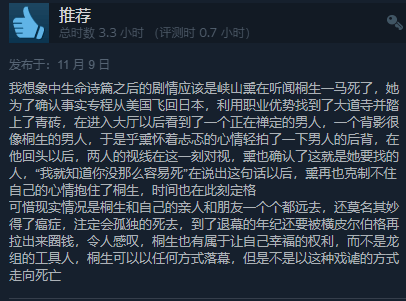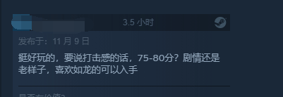 给出好评的玩家普遍表示本作主人公回归桐生一马主线找到了熟悉的感觉,战斗打击感也相当在线。与此同时也有玩家吐槽了制作组对桐生患癌的剧情安排。