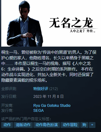 《如龙7外传:无名之龙》现已正式发售,截止发稿,本作在Steam平台共收录212篇用户测评,评价为“特别好评”。