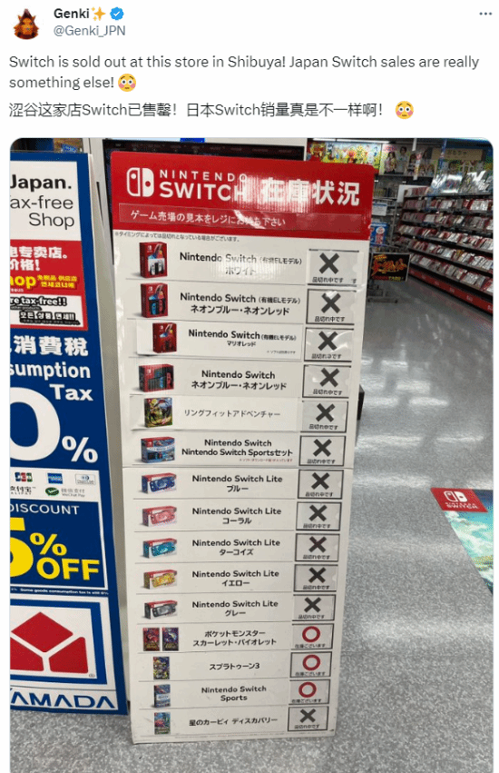 日前,据游戏博主@Genki_JPN透露,任天堂Switch的全部型号在涩谷的一家店铺全部售空。发售六七年了,其在日本的销量依然非常强劲。《星之卡比》游戏卡带、《健身环大冒险》也已卖光。