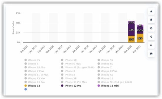 在2021年3月,iPhone 12 mini销量更是进一步下滑,销量占比仅4%。