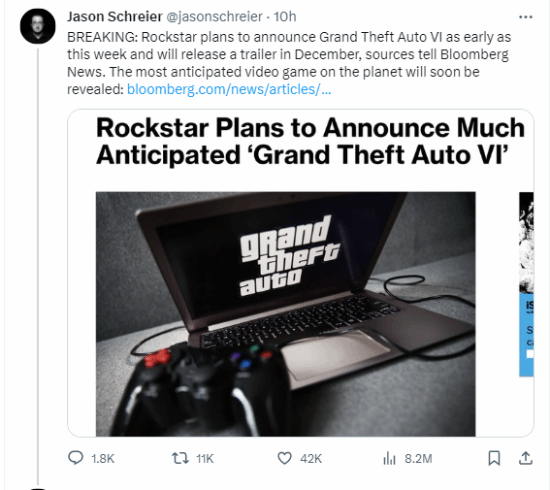 今日,知名记者Jason Schreier关于《GTA6》的爆料彻底点燃了玩家的热情,随后R星的官宣证实了Jason在业界的权威。短短半天时间,该推文的点赞数已经超过了4万。