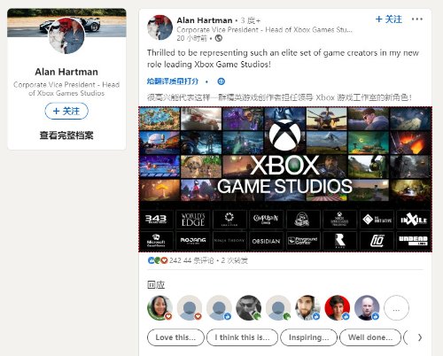 Hartman在领英上写道:“很高兴能在我领导Xbox游戏工作室的新角色中代表这样一群精英游戏创作者!”