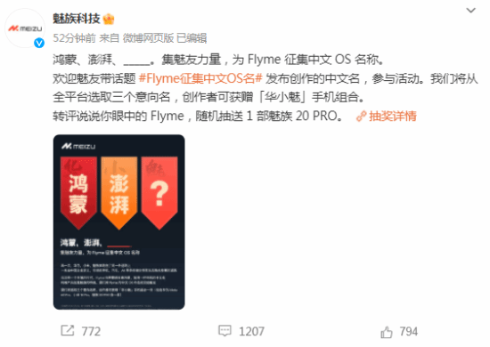今日,魅族科技官微宣布,开启为Flyme征集中文OS名称的活动。