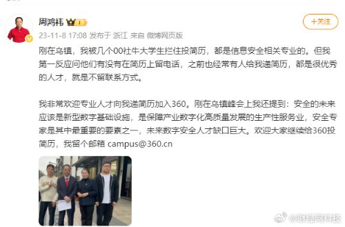 对此,周鸿祎微博回应称,“刚在乌镇,我被几个00社牛大学生拦住投简历,都是信息安全相关专业的。但我第一反应问他们有没有在简历上留电话,之前也经常有人给我递简历,都是很优秀的人才,就是不留联系方式。”并表示非常欢迎专业人才递简历加入360。