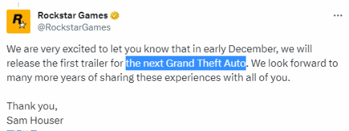 在R星总裁Sam Houser发布的公告中写到:“我们非常高兴地告诉大家,我们将在12月初发布下一部《侠盗猎车手》的首部预告片”,值得注意的是R星没有选择在公告中以GTA6命名。