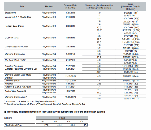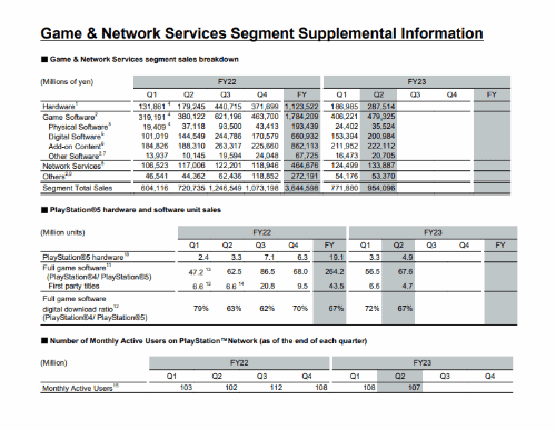 PS4/PS5游戏销量达6760万,其中470万为第一方游戏,数字版游戏下载率为67%。PlayStation Plus用户数量未更新,最新数据仍为2022财年第四季度的474万人。