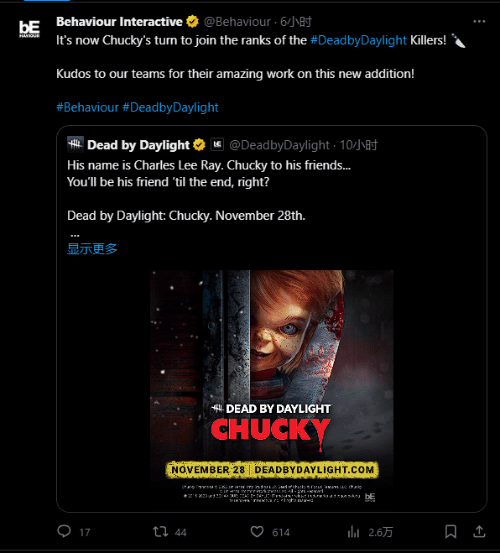 Behaviour Interactive日前宣布,旗下非对称多人生存恐怖游戏《黎明杀机》即将联动经典恐怖电影,鬼娃恰吉作为新杀手确定参战,预定11月29日上线,敬请期待。
