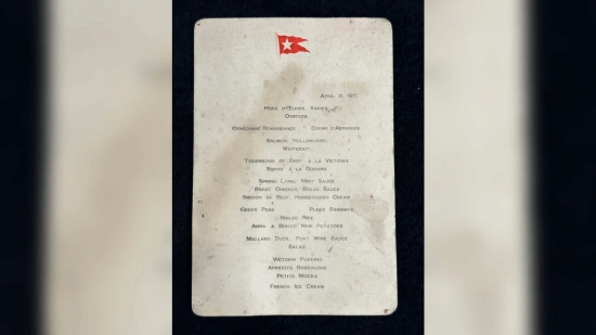 据拍卖行表示,这张菜单沾有严重水渍,部分字母被部分擦除,很可能是在1912年4月15日凌晨泰坦尼克号沉没时落入北大西洋的。