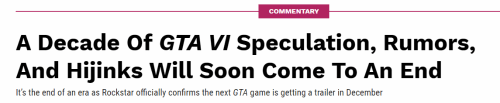 回顾过去,这十年来互联网上充斥着据称来自Rockstar的虚假公告,游戏被一次又一次的“预告”但都没有发生。12月初,万众瞩目的《GTA》新作首支预告片即将问世,媒体表示这标志着一个充满无休止猜测和胡闹的怪异时代的结束。