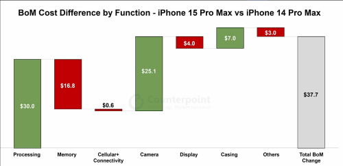 市场调查机构Counterpoint Research近日发布报告,表示苹果iPhone 15 Pro Max的物料成本,相比较iPhone 14 Pro Max增加了37.7 美元(约合275元)。
